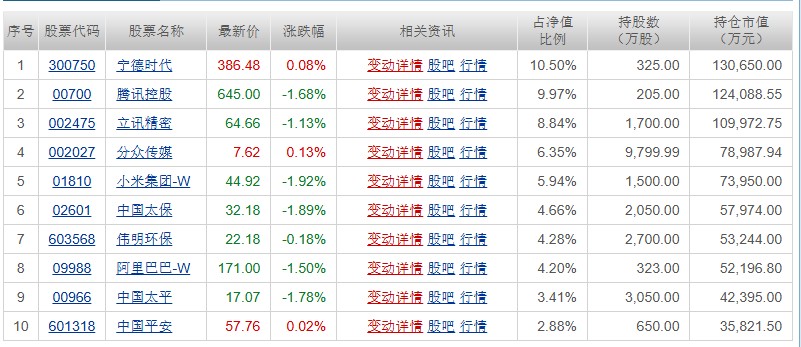 Among them, CATL and Tencent Holdings may have been passively reduced due to their stock prices reaching the 10% allocation limit; China Pacific Insurance and Weiming Environmental were actively reduced slightly by Zhao Feng.