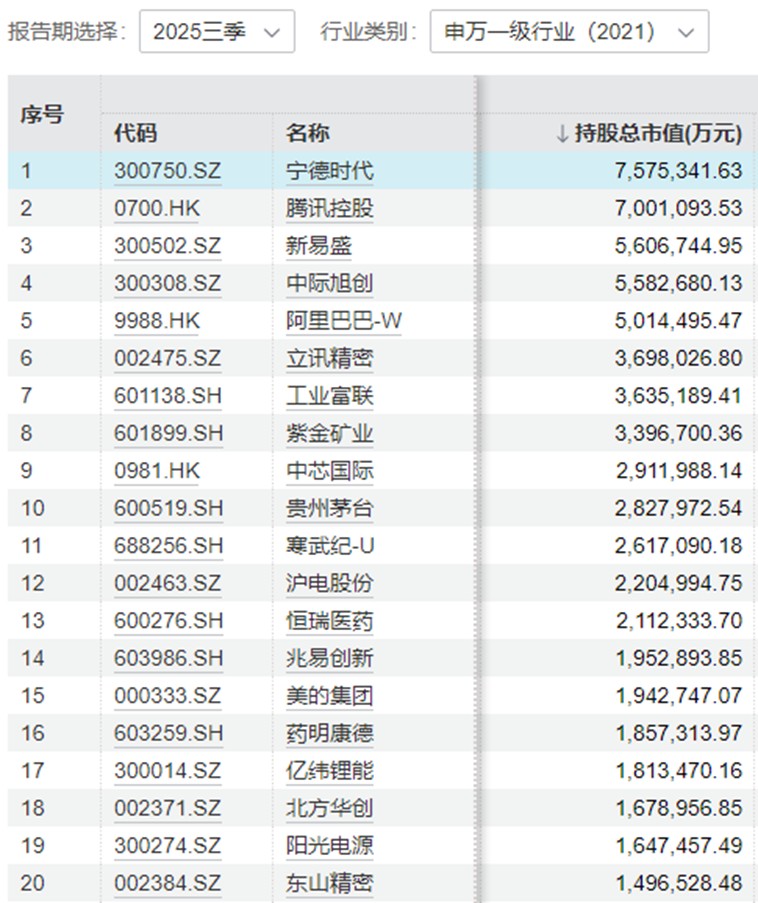 Wind data shows that, ranked by total market value of holdings, in the third quarter, CATL surpassed Tencent Holdings to reclaim the position of the most favored stock among active public funds. Tencent Holdings fell to second place.