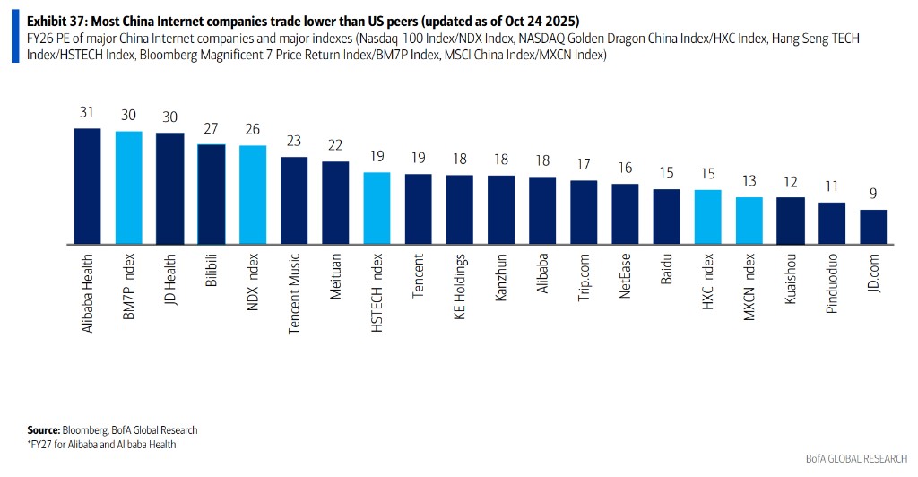 According to news from the Chasing Wind Trading Desk, Bank of America Merrill Lynch stated in a report on October 28 that Chinese internet companies have a distinct path in the AI field, focusing more on efficiency, practical use cases, and ecosystem strength. The current valuation of the Chinese internet sector is still at a "non-demanding level," with a forward price-to-earnings ratio of only 17 times. As regulatory tail risks decrease, choosing the right track will be key to obtaining returns.
