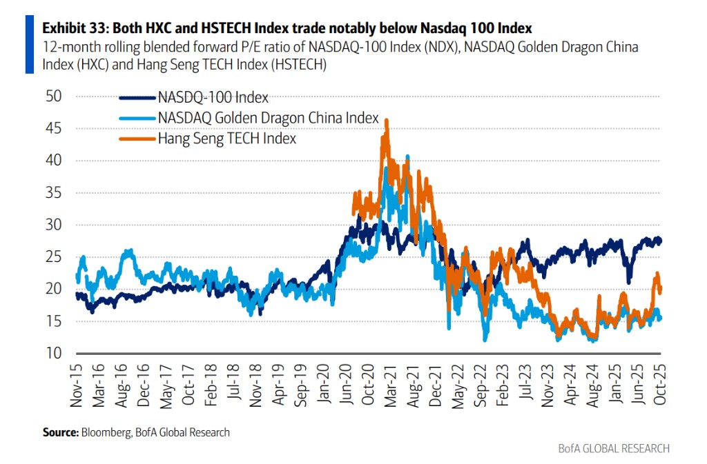 The Nasdaq Golden Dragon China Index is currently trading at a forward 12-month price-to-earnings ratio of 16 times, the Hang Seng Tech Index at 20 times, while the Nasdaq 100 Index is at 28 times, and the "Tech Seven Giants" Index at 33 times.
