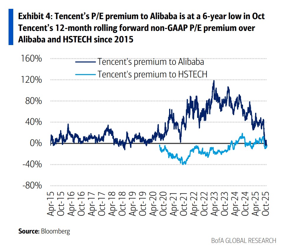 In terms of valuation, Tencent's price-to-earnings ratio premium over Alibaba is nearing a six-year low, close to the period of strict regulation in the gaming industry from 2018 to 2019.