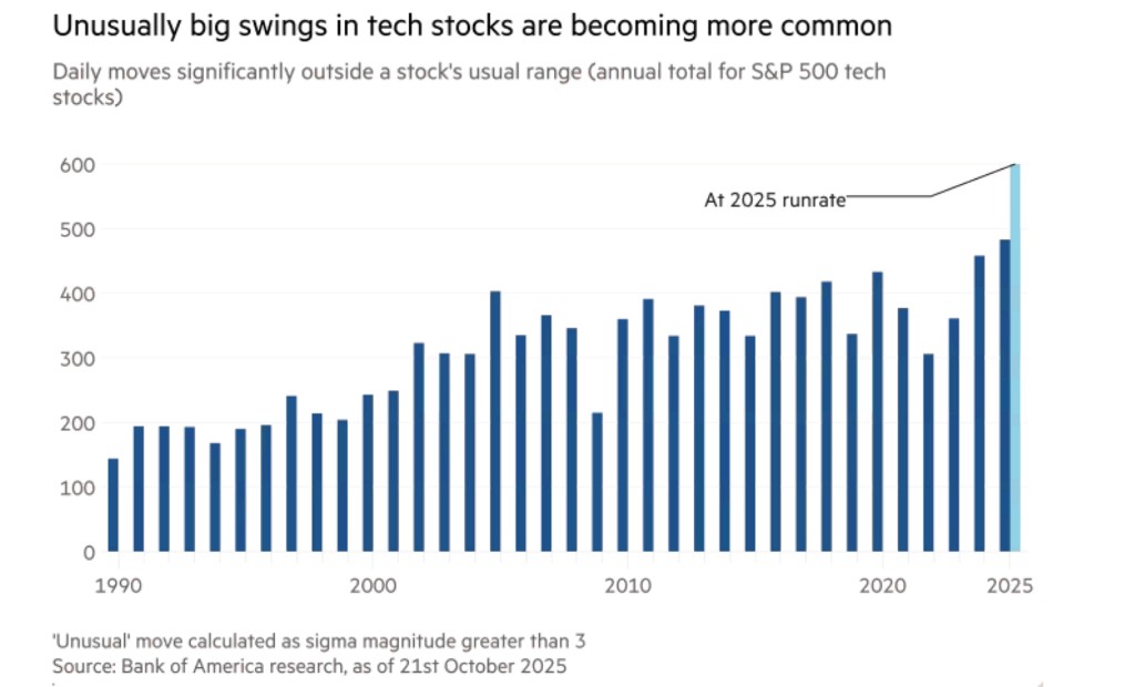 According to the latest statistics from Bank of America, there have been 119 instances this year where the market value of individual stocks on Wall Street has increased or decreased by more than $100 billion in a single day. This figure not only sets a record for the highest annual total in history but also indicates that the number of "fragility events" (i.e., stock prices far exceeding normal volatility ranges) encountered by tech giants this year has already surpassed the total for the entire year of 2024 within just 10 months.