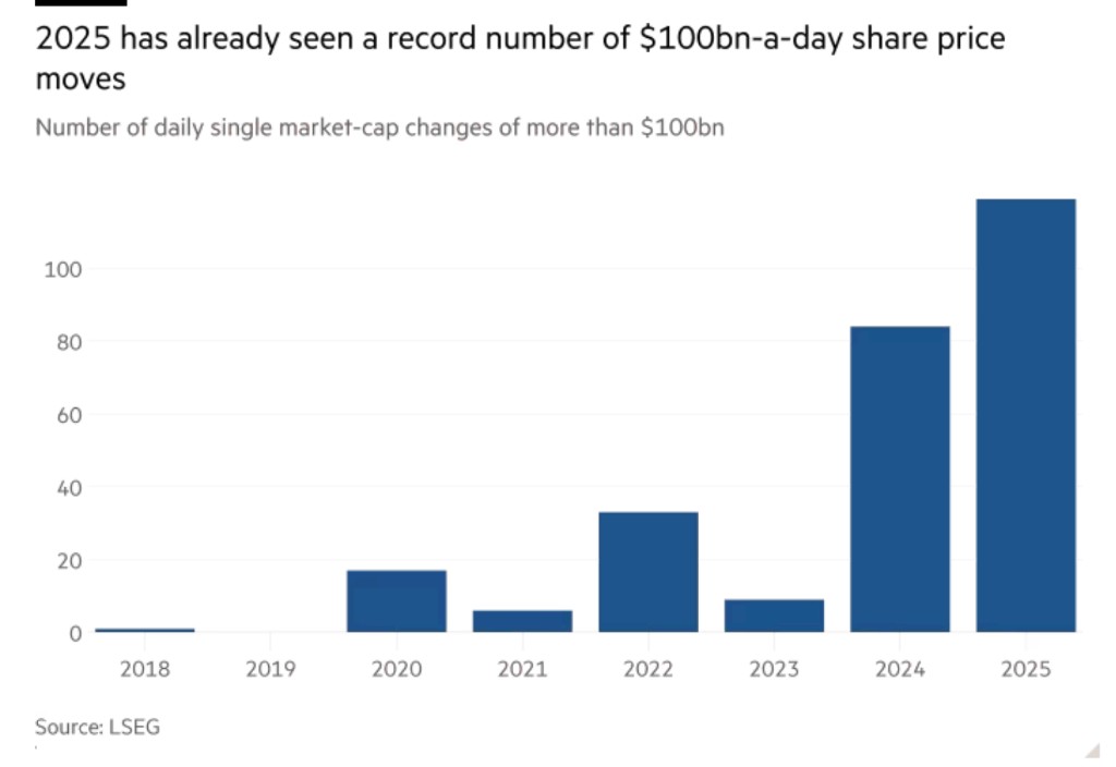 According to Bank of America data, the number of instances this year where market value fluctuations exceeded $100 billion in a single day has reached 119, far exceeding last year's 84 and the 33 during the bear market of 2022. Abhi Deb, head of global cross-asset quantitative investment strategy at Bank of America, stated: