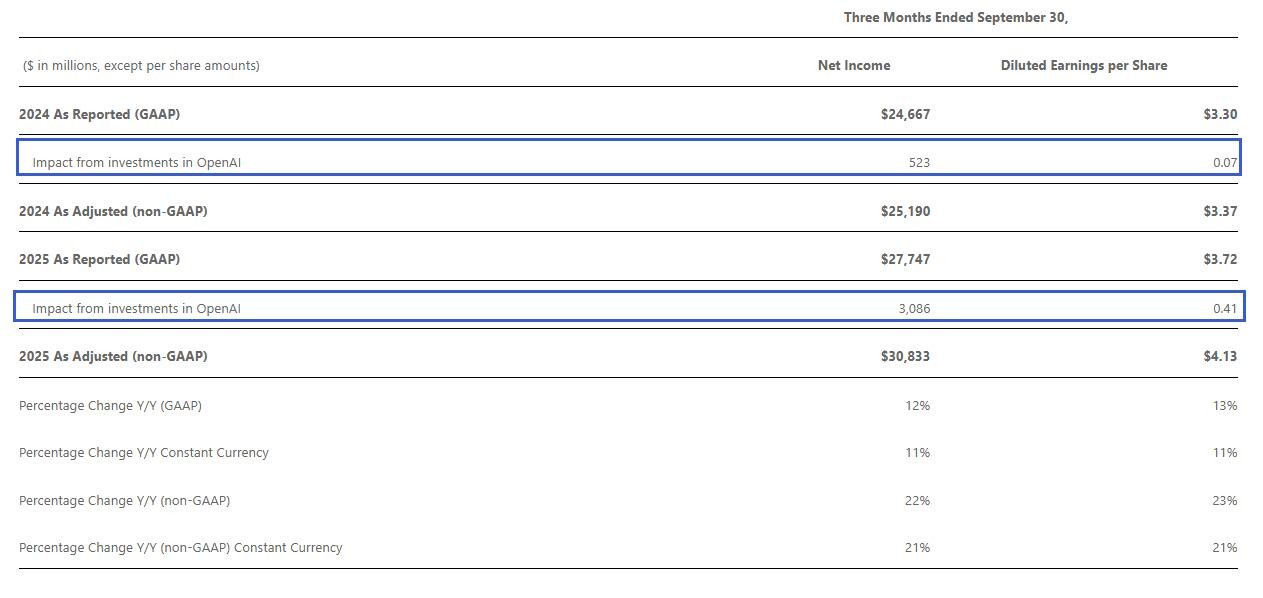 The earnings report showed that under GAAP standards, the investment in OpenAI impacted Microsoft's net profit by $3.086 billion in the third quarter, far exceeding the $523 million from a year ago, with an impact on EPS earnings of $0.41 per share, also significantly higher than the $0.07 per share from a year ago.