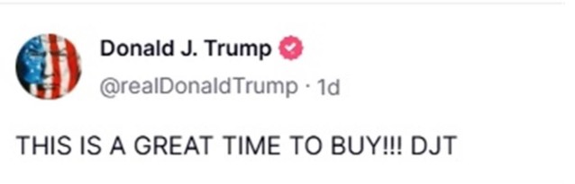 One of the most striking incidents occurred when the U.S. stock market experienced severe fluctuations due to tariff policies. About four hours before announcing the suspension of the tariff policy, Trump posted in all caps on his social platform Truth Social: "This is a great time to buy!!! DJT." Although DJT is also an abbreviation of his name, it is simultaneously the stock code for Trump Media. On that day, DJT's stock price closed up 22.67%, and the value of the shares held by Trump himself was estimated to have increased by $415 million.