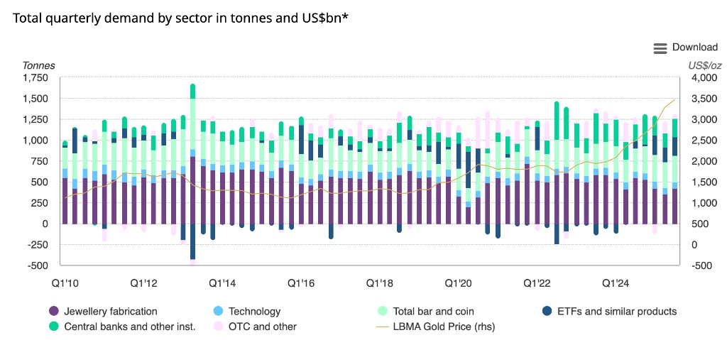 The report indicates that global gold demand (including over-the-counter transactions) reached 1,313 tons in the third quarter of 2025, with a total demand value of $146 billion, setting a record for quarterly gold demand. Notably, inflows into gold ETFs also reached an all-time high during the same period, with global inflows totaling $26 billion.