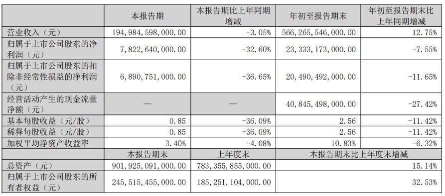 - Third-quarter revenue was 195 billion yuan, a year-on-year decrease of 3.05%, marking the first negative growth in single-quarter revenue in recent times; net profit attributable to shareholders was 7.82 billion yuan, a year-on-year plunge of 32.6%