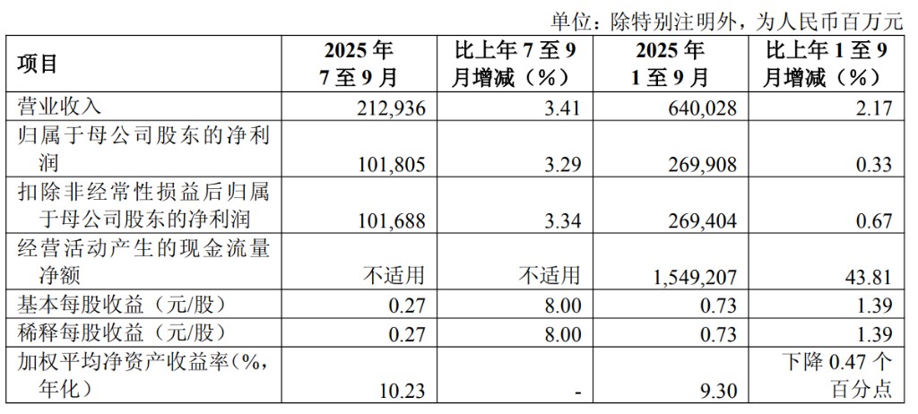 In the first three quarters of 2025, ICBC's operating income was 640.028 billion yuan, a year-on-year increase of 2.17%. The net profit attributable to shareholders of the parent company was 269.908 billion yuan, a year-on-year increase of 0.33%.