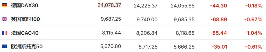 - As of the time of writing, the German DAX index was down 0.18%, the UK FTSE 100 index was down 0.67%, the French CAC40 index was down 1.04%, and the Euro Stoxx 50 index was down 0.61%.