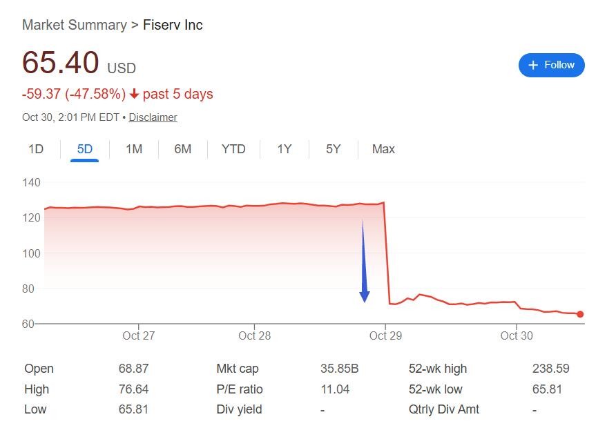 BTIG described Fiserv's earnings report as "shockingly bad" and "terrible." Analysts at William Blair wrote in their report: "Given that we believe the third-quarter revenue and earnings per share were shockingly poor, along with the sudden management transition, we can no longer recommend Fiserv."