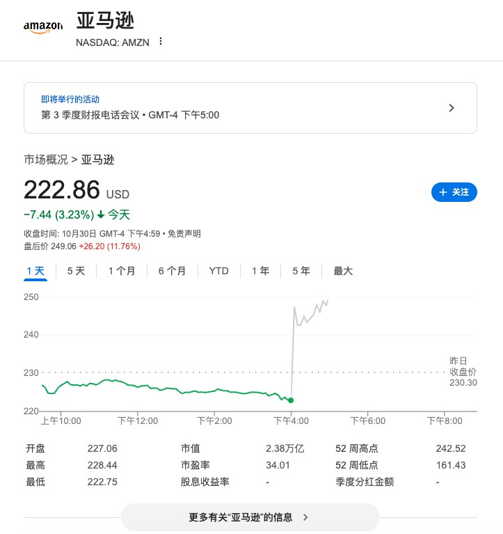 Amazon announced its financial results after the market closed on Wednesday, showing that the company's third-quarter performance exceeded analysts' expectations, with its cloud business achieving the largest growth in three years, driving the company's stock price up nearly 12% in after-hours trading.