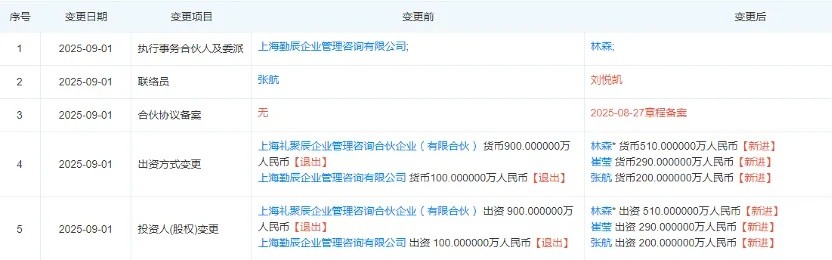 On September 1, the executive partner of Qincheng Fund changed from "Shanghai Qincheng Enterprise Management Consulting Co., Ltd." to Lin Sen personally; on the same day, the company's contact person changed from Liu Yuekai to Zhang Hang, and a new partnership agreement was filed.