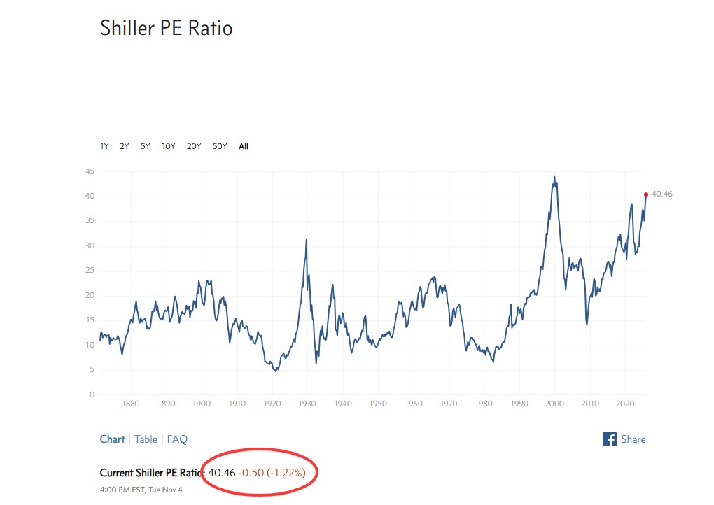 The famous valuation metric—Cyclically Adjusted Price-to-Earnings Ratio (Shiller P/E)—has recently surpassed 40, marking the second time in history it has reached this high level, the last occurrence being during the internet bubble in 1999. Predictions based on this valuation model indicate that the real returns of large-cap growth stocks in the U.S. over the next decade may be negative