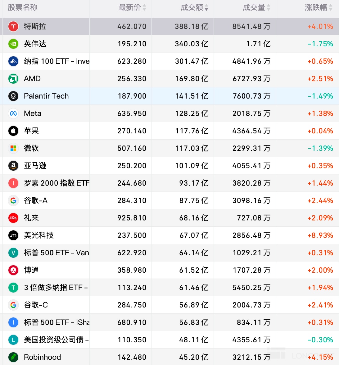 11 月 6 日(週三)美股成交額第 1 名特斯拉收高 4.01%,成交 388.18 億美元。據媒體報道,特斯拉在印度銷量慘淡,目前正在調整其市場戰略,現已聘請蘭博基尼印度公司前負責人 Sharad Agarwal 負責印度當地業務。Agarwal 將在本週上任,任務是重振特斯拉印度市場推進計劃。知情人士還稱,聘請 Agarwal 是特斯拉為印度制定更具本土化戰略的一部分。自 7 月中旬在印度啓動銷售以來,特斯拉印度已接到超過 600 輛汽車的訂單,這一數字未達到該公司自身的預期。此外有報道稱,規模達 2 萬億美元的挪威主權財富基金表示,在本週的股東會議前,該基金已投票反對馬斯克在特斯拉近萬億美元的薪酬提案,理由是其規模過大、存在股權稀釋以及關鍵人物風險。第 2 名英偉達收跌 1.75%,成交 340.03 億美元。該股在過去 5 個交易日中有 4 日收跌。據報道,美國知名 “空頭” 邁克爾·伯裏説,他已押注逾 10 億美元做空英偉達公司等科技企業。據 SEC 監管文件顯示,伯裏已斥資約 11 億美元,買入對英偉達和軟件企業帕蘭蒂爾公司的看跌期權。
