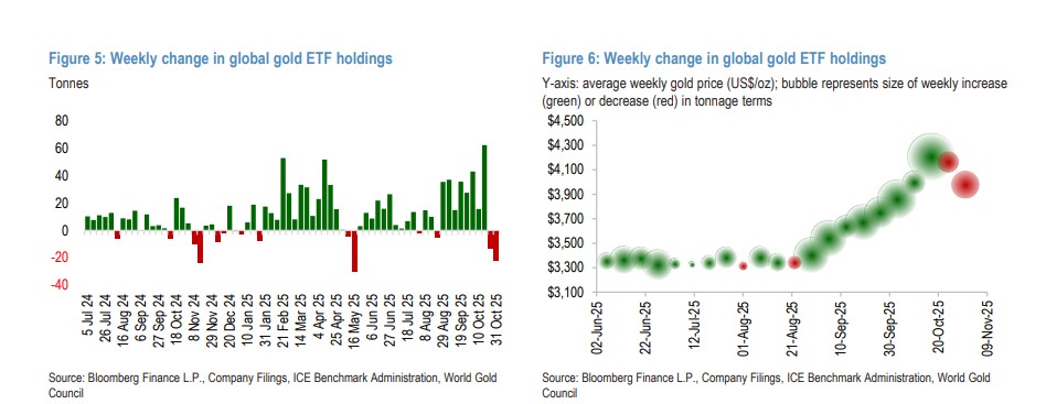 Data shows that in the past two weeks, global gold ETFs experienced a net outflow of about 35 tons. However, this outflow is only about half of the record inflow of 62 tons for the week ending October 17. JP Morgan's analysis suggests that the speed of fund outflows has not been as rapid as during inflows, indicating that current ETF holdings are "relatively sticky."