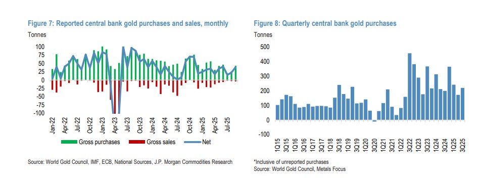 JP Morgan's report provides encouraging data: in the third quarter of 2025, the total net gold purchases by global central banks reached 220 tons, a quarter-on-quarter increase of 30%, equivalent to an annualized purchase rate of 880 tons It is particularly noteworthy that even in September, when the average gold price was USD 3,668 per ounce, the officially reported net purchase volume still reached 39 tons, making it the strongest month since 2025.