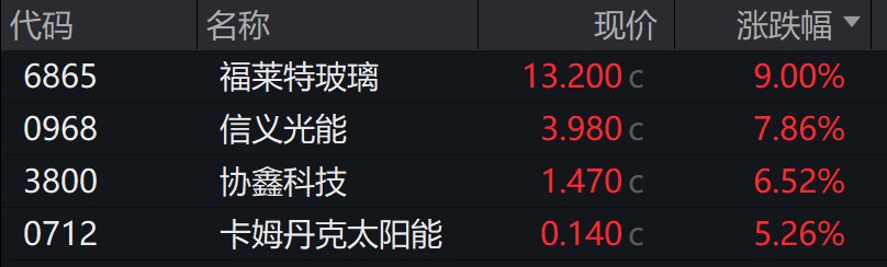 福萊特玻璃漲至 9%,信義光能漲超 6%,協鑫科技上漲。
