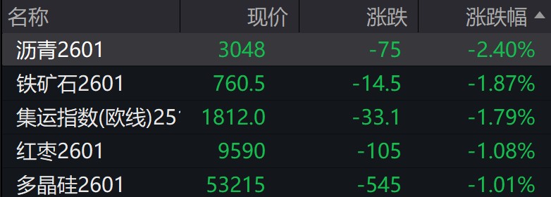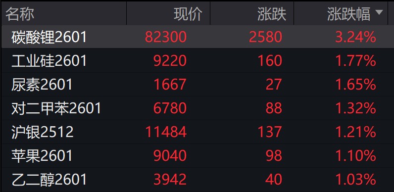 商品:截至收盤,碳酸鋰漲超 3%,工業硅、尿素、滬銀、蘋果、乙二醇均漲超 1%;鐵礦石、集運指數 (歐線) 均跌超 1%。