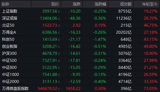 A 股:截至收盤,三大股指集體小幅下跌,滬指跌 0.25%,深成指跌 0.36%,創業板指跌 0.51%。北證 50 漲幅 0.19%,萬得微盤股指漲幅 0.3%。
