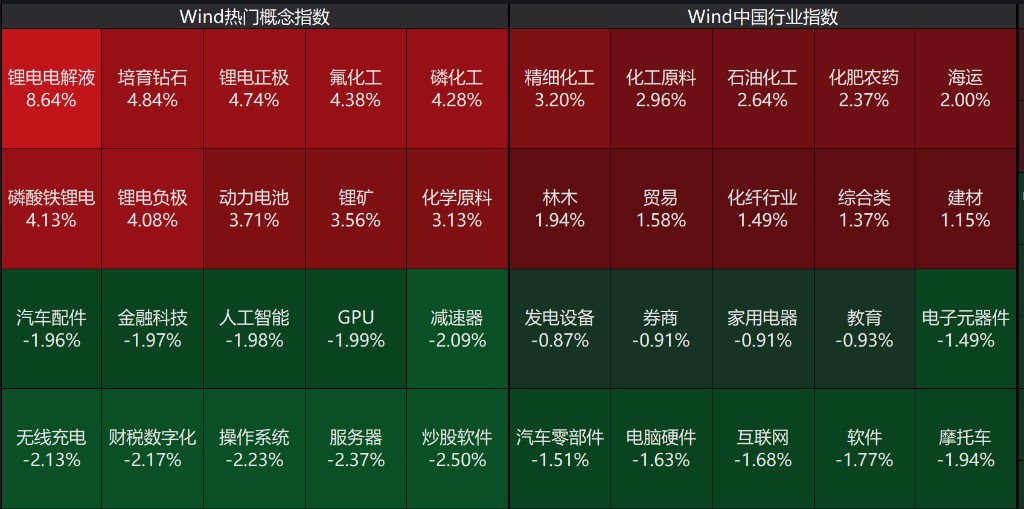 盤面上,個股跌多漲少,滬深京三市超 3100 股飄綠,今日成交 2.02 萬億。板塊方面,化工股大漲,氟化工、磷化工方向領漲,鋰電池、固態電池題材走強。服務器、DeepSeek、金融科技指數跌幅靠前,機器人、CRO、消費電子概念股調整。