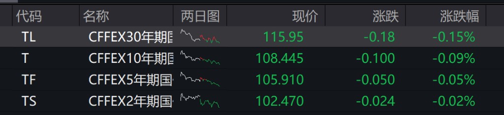 債市:國債期貨全線下跌,截至收盤,30 年期主力合約跌 0.15%,10 年期主力合約跌 0.09%,5 年期主力合約跌 0.05%,2 年期主力合約跌 0.02%。