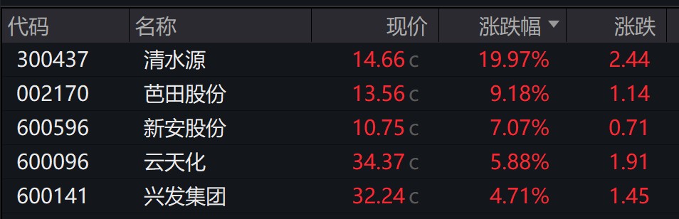 氯鹼化工、永太科技、多氟多、中欣氟材等多股漲停,新宙邦漲超 8%,濱化股份、石大勝華等多股跟漲。磷化工清水源 20cm 漲停,走出兩連板。
