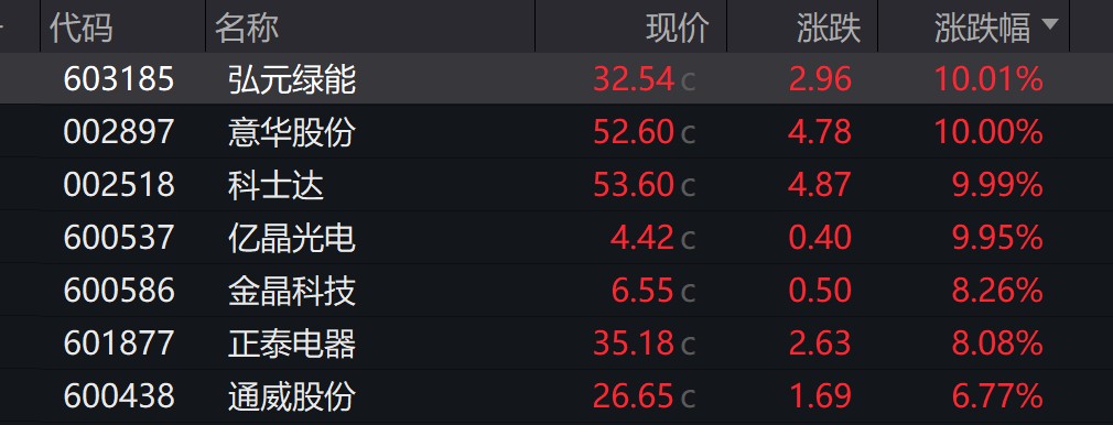 光伏股持續走強,弘元綠能強勢封板,收盤漲停。意華股份、科士達緊隨其後,均以漲停報收。億晶光電大漲近 10%,表現活躍。