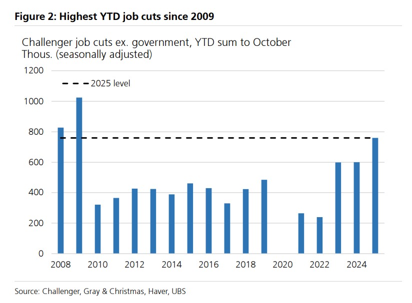 UBS warns that the so-called narrative of "low hiring, low layoffs" in the U.S. job market is collapsing. As of October, the cumulative number of layoffs in the U.S. this year has reached the highest level since 2009.