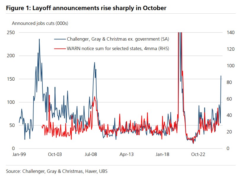 According to the Wind Trading Desk, UBS analysts stated in a report on November 6 that the latest Challenger layoff data shows that the seasonally adjusted layoff announcements in October reached 192,000, a month-on-month surge of 126,000.