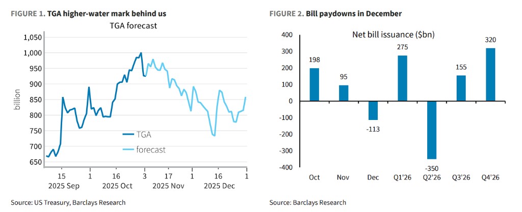 To achieve the $850 billion cash target, the net issuance of Treasuries before the end of the year will be minimal. More specifically, there will still be net issuance in November, but there will be significant net repayments in December. According to signals from the Treasury during the fourth quarter refinancing meeting, the net repayment of Treasuries in December will be between $100 billion and $120 billion, which will be an important "tailwind" for liquidity before the end of the year.