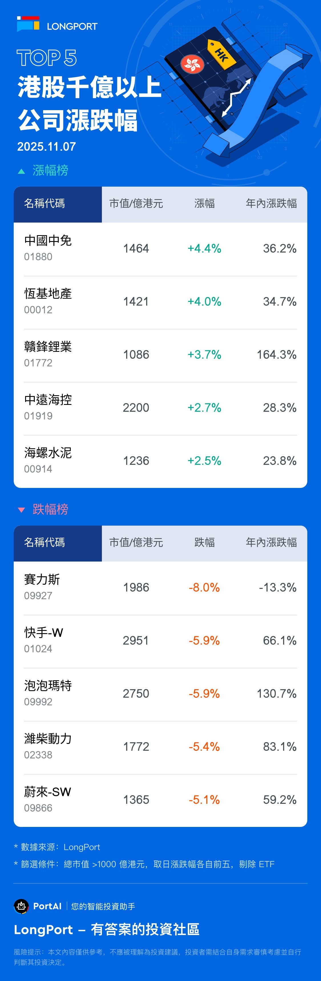 中國中免 (01880) 涨 4.35%,成交额 8.8 亿港元,年内累计涨 36.2%。 恆基地產 (00012) 涨 3.97%,成交额 4.8 亿港元,年内累计涨 34.7%。 賽力斯 (09927) 跌 7.99%,成交额 7.8 亿港元,年内累计跌 13.3%。 快手-W(01024) 跌 5.93%,成交额 35.3 亿港元,年内累计涨 66.1%。