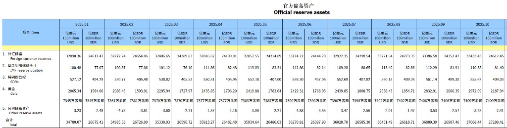 On November 7th, Friday, the State Administration of Foreign Exchange statistics showed that as of the end of October 2025, China's foreign exchange reserves amounted to USD 33,433.4 billion, an increase of USD 4.68 billion from the end of September, with a growth rate of 0.14%.