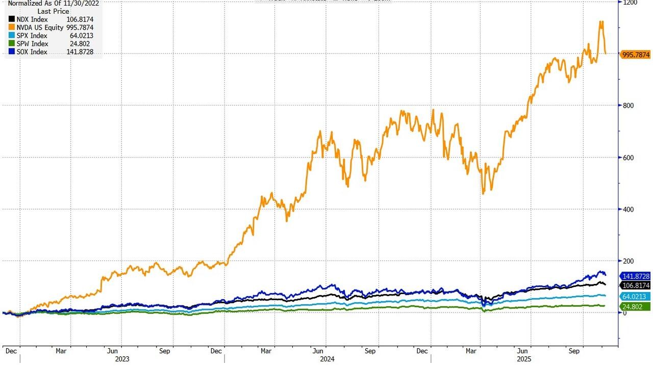 As the third anniversary of ChatGPT's launch (November 30, 2022) approaches, it's time to review this round of the U.S. stock market AI bull market: the equal-weighted S&P index rose 24%, the S&P 500 index rose 64%, the Nasdaq rose 107%, the semiconductor index (SOX) rose 142%, and NVIDIA rose 995%