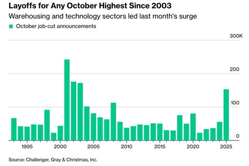 The U.S. labor market is experiencing a sharp cooling, with a surge in layoff announcements. In October, the number of layoffs reached 153,000, the highest in over 20 years. The number of WARN Act notifications from Goldman Sachs has also hit a new high since 2016, indicating an increased risk of potential employment recession. Investors are focusing on private sector data, which shows that employment momentum is rapidly declining, reshaping market expectations for the economic outlook and putting new pressure on the Federal Reserve