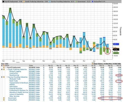Other high-frequency data also corroborate this trend. According to the latest weekly report released by ADP, in the four weeks ending October 25, private enterprises averaged a reduction of 11,250 jobs per week, which means that in just the second half of October, the private sector may have lost about 45,000 jobs. This is the largest monthly employment decline since March 2023 Another data company, Revelio Labs, also shows a pessimistic outlook in its report. Its data indicates that 9,100 jobs were lost in October, marking the second worst monthly performance of 2025. Although this decline was primarily driven by a reduction in government positions, job losses were also observed in the manufacturing and trade sectors.