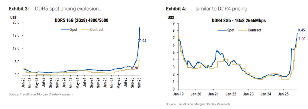 - DRAM prices have soared: The contract quotes for server DRAM in the fourth quarter of 2025 have seen an astonishing increase of nearly 70%, far exceeding Morgan Stanley's previous prediction of 30% Due to concerns about further price increases and supply shortages, customers seem to have no choice but to accept. The quotes for DDR4 have also risen by 50% due to strong demand for network switches in U.S. data centers.
