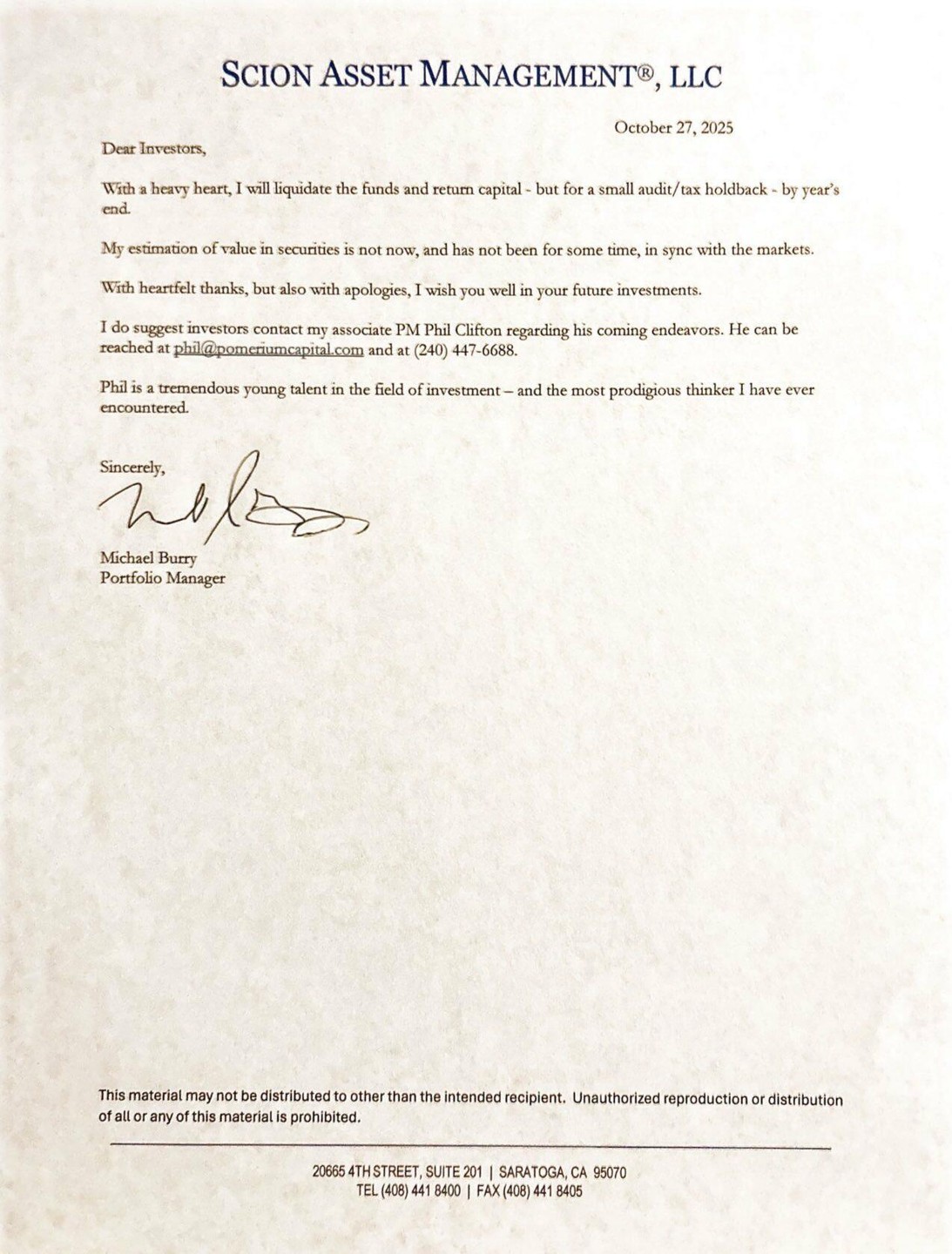 There are rumors circulating online about a letter Burry sent to investors at the end of last month, in which he wrote: "With a heavy heart, I will liquidate the funds and return capital by the end of the year—though a small amount will be deducted for auditing/tax purposes."