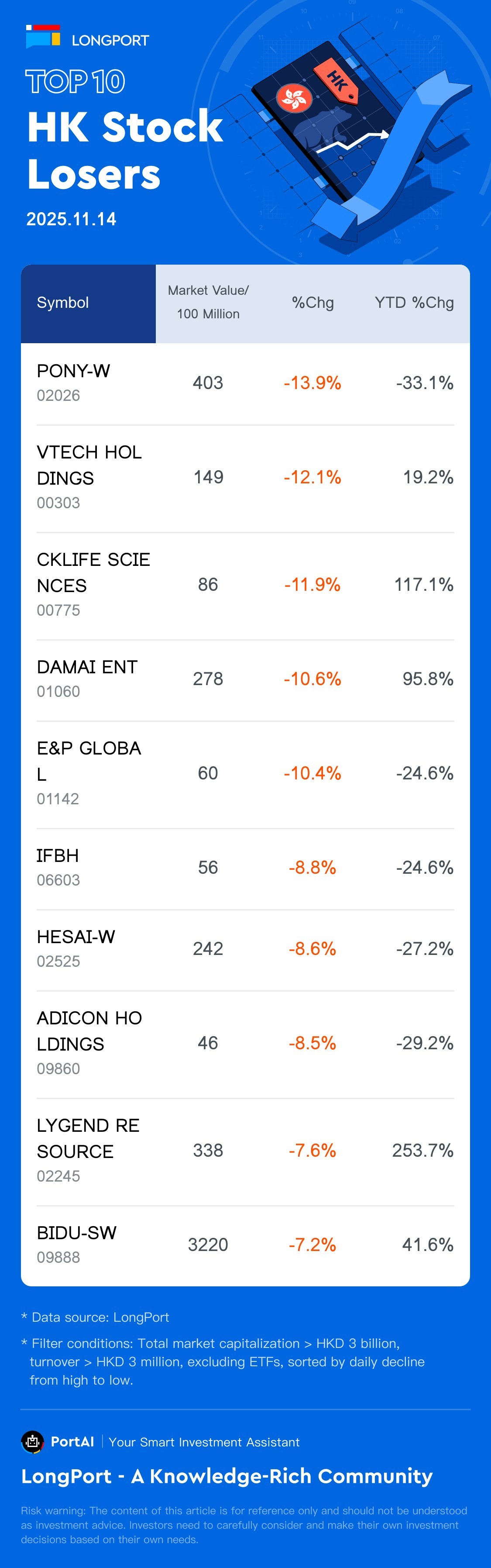 PONY-W(02026) fell 13.89%, with a trading turnover 276.2 Million HKD, and a year-to-date fell 33.1%. VTECH HOLDINGS(00303) fell 12.11%, with a trading turnover 344.9 Million HKD, and a year-to-date rose 19.2%. CKLIFE SCIENCES(00775) fell 11.88%, with a trading turnover 62.7 Million HKD, and a year-to-date rose 117.1%.