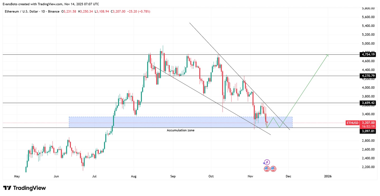 ETH continues moving inside a descending channel, yet the lower boundary aligns perfectly with the major accumulation zone.
