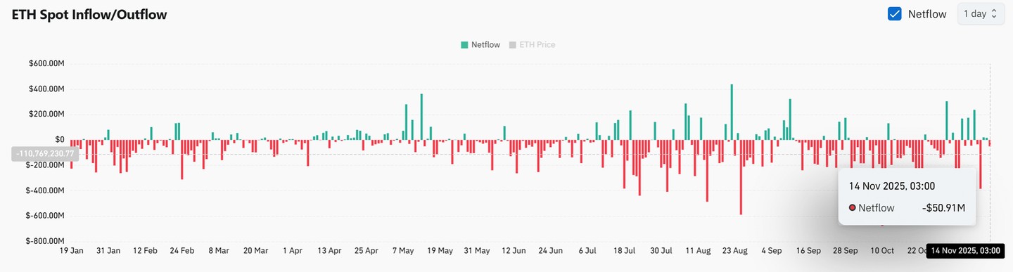 Spot market flows indicate sustained accumulation pressure, with ETH registering a significant $50.91 million outflow in the latest session.