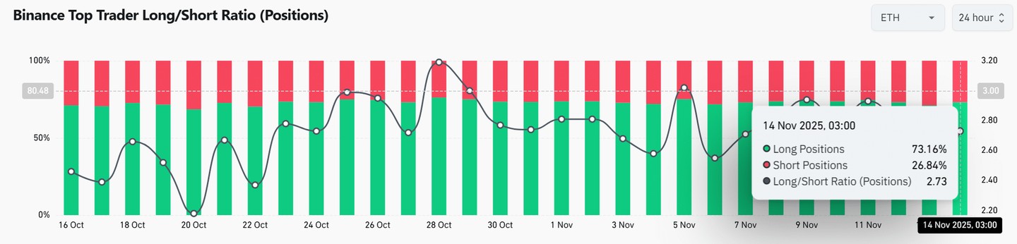 Binance top-trader positioning reveals 73.16% long exposure versus 26.84% short exposure, at the time of writing. This signals strong bullish sentiment among experienced traders.