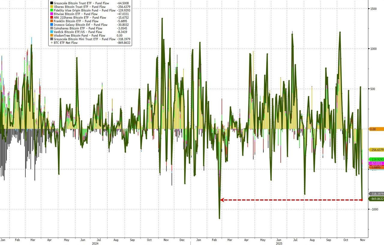 On Thursday, the outflow of funds from the U.S. spot Bitcoin ETF reached $869.9 million, marking the second-largest outflow on record. The largest single-day net outflow occurred on February 25, 2025, when these funds saw an outflow of as much as $1.14 billion in a single day.