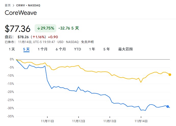 Meanwhile, companies related to OpenAI faced significant declines. Oracle's stock price fell over 9% this week, and data center cloud service provider CoreWeave plummeted nearly 30%.