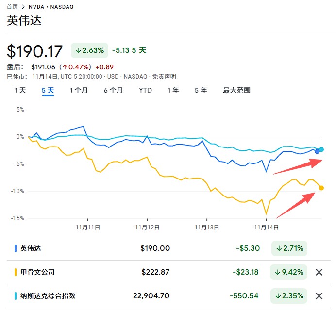 According to Dow Jones market data, this was the largest intraday reversal for the index since the tariff turmoil in April. The S&P 500 index also reduced its early significant decline, ultimately closing down less than 0.1%, while the Dow fell 0.7%, about 310 points NVIDIA's stock price rebound on Friday afternoon helped it barely close up for the week, providing a relatively stable starting point for its earnings report next Wednesday.