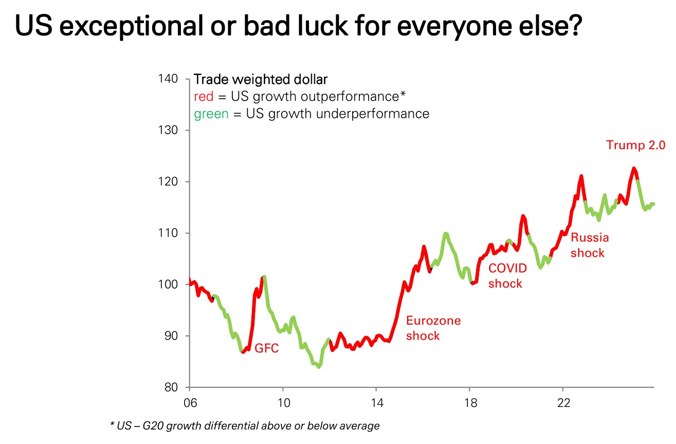 The report points out that over the past two decades, the strengthening of the dollar has often been accompanied by stronger growth in the US relative to other G20 economies, and this "American exception" is often not due to particularly fast growth in the US itself, but rather the emergence of more damaging shocks in other regions globally (such as the European debt crisis, the pandemic, and the Russia-Ukraine conflict). Therefore, whenever there is turmoil in the world and other countries face setbacks, the US appears relatively stronger, and the dollar rises accordingly. In short, the dollar's strength comes more from "others doing worse" rather than "the US being too strong."