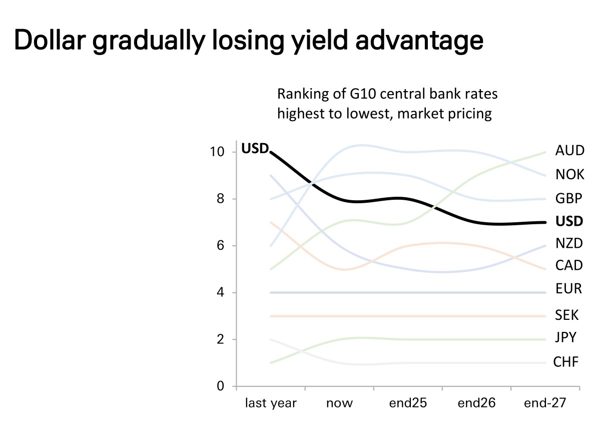 However, this core pillar is crumbling. Based on market pricing forecasts for G10 central bank interest rates, the dollar's yield ranking is facing a significant decline. The report's charts indicate that the dollar's interest rate ranking among G10 currencies is expected to gradually drop from its peak "last year" and "now" to a mid-range position by the end of 2026 and 2027. Meanwhile, currencies such as the British pound, Australian dollar, and Norwegian krone are expected to surpass the dollar in yield ranking.