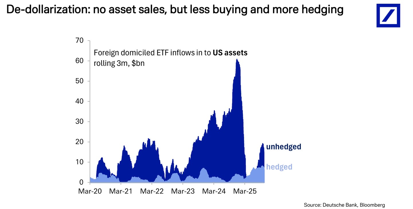 Among the foreign ETF funds flowing into U.S. assets, the inflow of “unhedged” funds has been continuously declining, while the inflow of “hedged” funds has been steadily increasing. This means that although overseas investors are still buying U.S. assets, they are increasingly inclined to hedge against the risk of dollar depreciation. This “de-dollarization” hedging behavior itself constitutes downward pressure on the dollar, reflecting the market's pessimistic expectations for the future trend of the dollar.