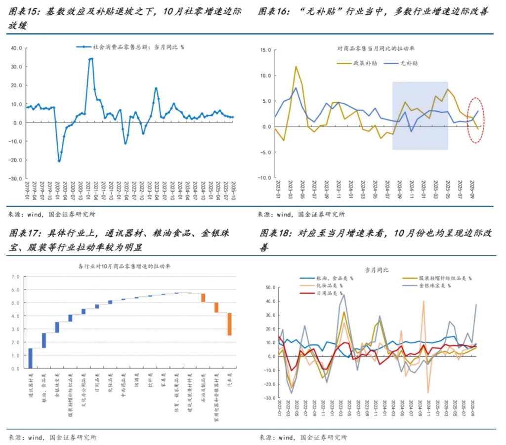 This week, domestic economic data has been gradually disclosed, showing that total consumption data remains weak, with further marginal slowdown in retail sales growth. The underlying reasons are the high base effect from last year and the tapering of consumption policy subsidies. However, at the structural level, most domestic demand industries are showing signs of marginal improvement: when breaking down the retail sales structure, the "policy subsidy" (corresponding to industries supported by the "trade-in" policy) and "non-subsidy" industries have seen a reversal in their contribution to retail sales. The "policy subsidy" industries have begun to make a negative contribution to retail sales of above-limit goods (mainly due to the drag from home appliances and automotive-related categories); meanwhile, the contribution from "non-subsidy" industries has shown marginal improvement, possibly driven by the impact of "Double Eleven" on related consumer categories. Specifically, the most noticeable improvements are concentrated in the grain and oil food, clothing, daily necessities, and gold and jewelry industries.