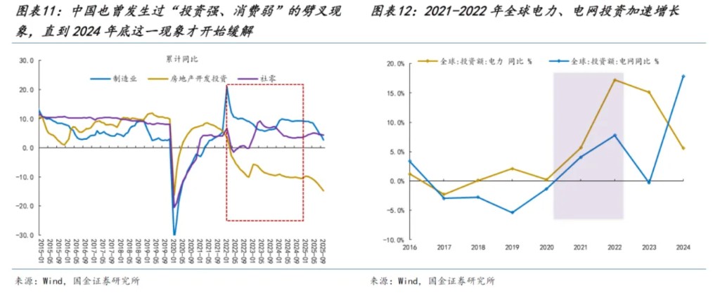 However, it is worth noting that overseas tech giants are still making significant capital investments, and there are currently no signs of cooling down. In this context, it is premature to assert that the U.S. economy is about to fall into recession solely based on the "weak performance" of U.S. consumer company earnings data; further observation of more economic data is still needed. In fact, this phenomenon of "strong investment, weak consumption" has also occurred in China from 2022 to 2024: as real estate investment demand continues to be suppressed and the growth rate of real estate investment declines, the wealth effect combined with weakening income expectations has led to a persistent lack of effective internal demand; in contrast, under the backdrop of domestic transformation towards high-quality development and resilient external demand, the growth rate of China's manufacturing investment has remained resilient, thus continuously contributing positively to GDP growth. Additionally, it is worth mentioning that, similar to the late-stage new energy construction from 2019 to 2021 (which also faced global electricity shortages from 2020 to 2022), global investments related to electricity and power grids saw a significant increase in 2021-2022. As the shortage of overseas power systems becomes a core contradiction restricting the development of the AI industry, we believe it is more important to focus on the potential transmission of investments towards electricity and physical investments during the accelerated development of the AI industry. The real core question is: is it the power shortage that is hindering the development of computing power, or is it the wave of computing power that is driving the investment in electricity?