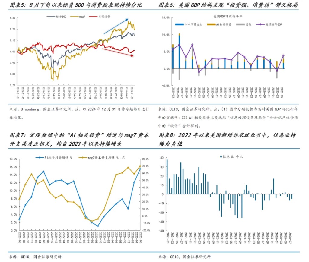 Second, the divergence between U.S. consumer stocks and the S&P 500 stock price trends also reflects the market's concerns about a potential U.S. economic recession. Currently, the U.S. economy is more characterized by the booming AI industry and the marginal weakening of low-end consumption under a K-shaped divergence ("strong investment, weak consumption"). From the perspective of U.S. real GDP, AI-related investments (measured by the sum of "information processing equipment and software" and "software" in the intellectual property category, which account for over 6% of real GDP) are expected to drive an average growth of about 1.4 percentage points in U.S. real GDP in the first two quarters of 2025, surpassing the contribution from private consumption expenditures, which account for nearly 70% of the U.S. economy (averaging a contribution of 1.1 percentage points in the first two quarters). On one hand, AI giants represented by "mag7" are showing strong capital expenditures, and the growth rate of "mag7" Capex is highly positively correlated with the growth rate of "AI-related investments" in macro data, indicating that the development of the AI industry indeed supports the resilience of the U.S. investment side On the other hand, the advancement of AI technology is accompanied by structural layoffs (large tech companies such as Microsoft, Amazon, and Google are all laying off employees), combined with the suppression of the job market by high interest rates, leading to a downward trend in employment and income expectations, which has already resulted in a marginal slowdown in consumption demand among the middle and low-income groups in the United States. This has also been reflected in the earnings reports of consumer companies in the U.S. stock market, as since the second quarter of this year, the "consumer staples" sector within the S&P 500 has shown a continuous divergence in EPS and ROE performance compared to the S&P 500 and "mag7."